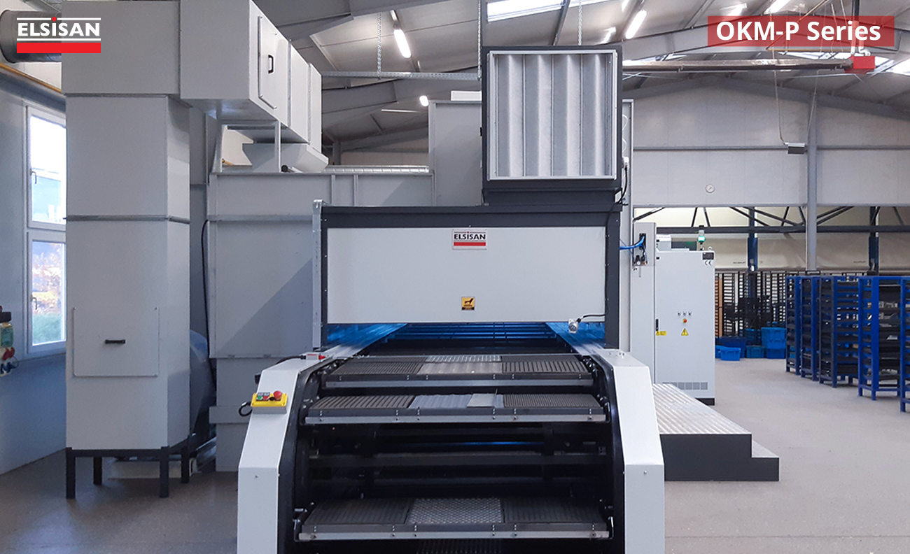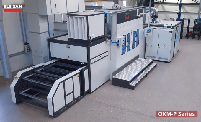 This flat bed machine is used in spray application to vibration dampers. Parts are spray coated with rubber to metal bonding agent.