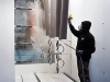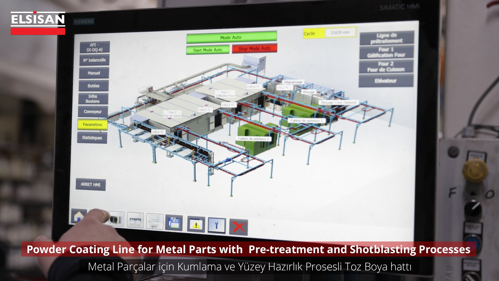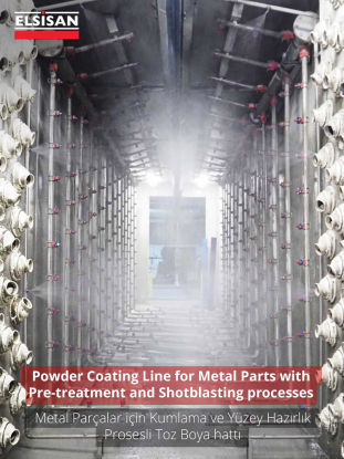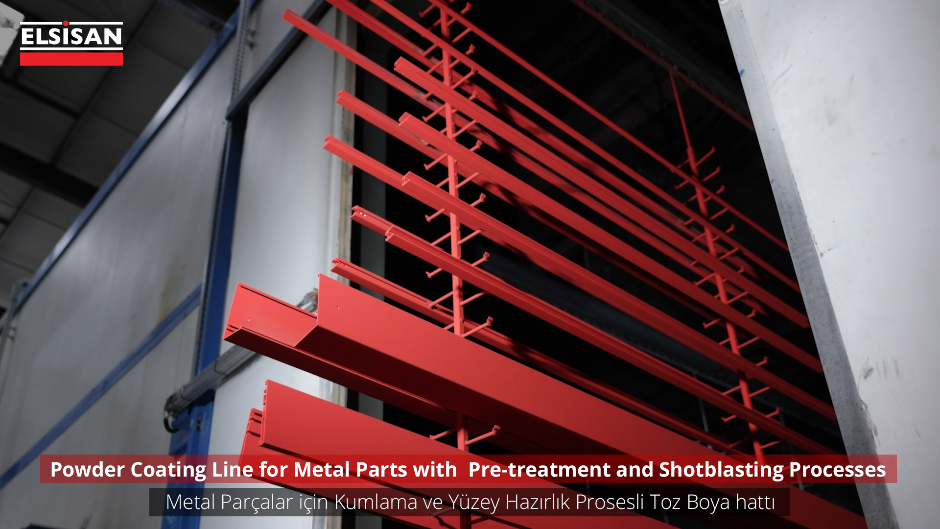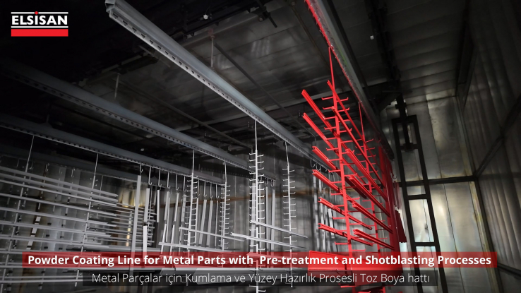 Powder coating line for metal parts with shotblasting and pre-treatment processes