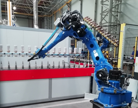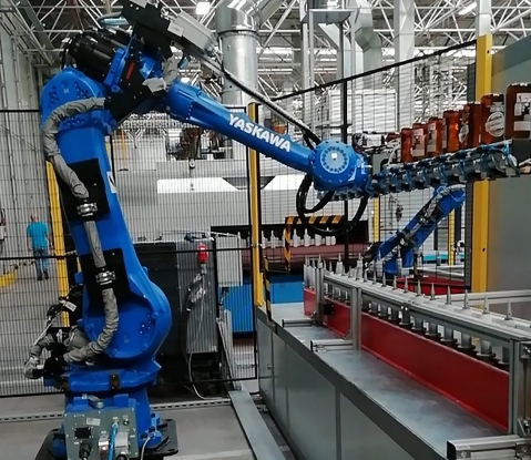 In automatic paint machines used in mass production, loading and unloading can be done by robots work in coordination with the paint machine. In this way, delays, errors, and damages caused by workers are prevented. Since the loading and unloading can be done very fast, the speed of the paint machine can be increased to the maximum level.