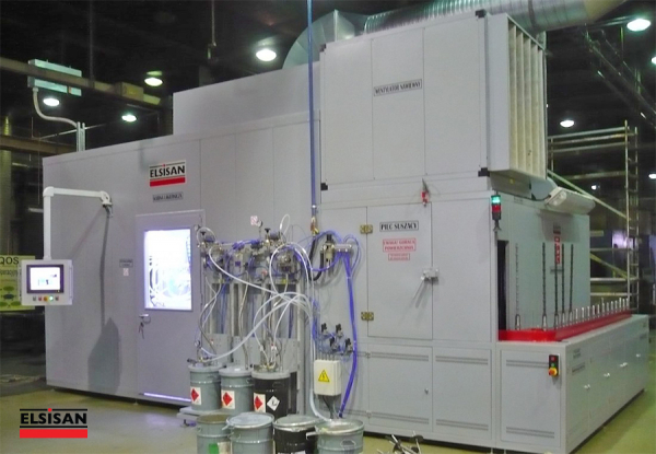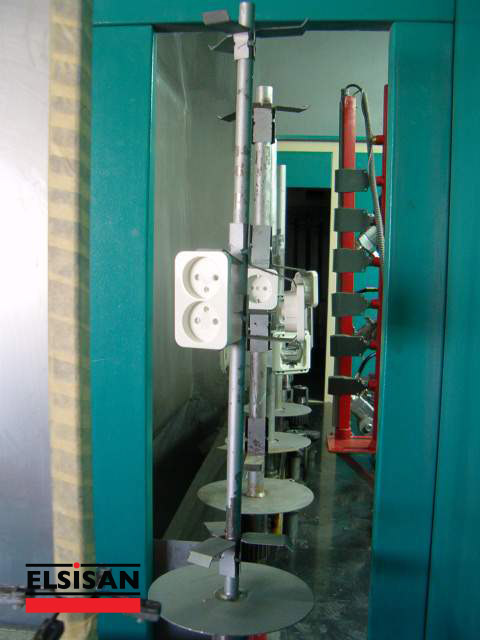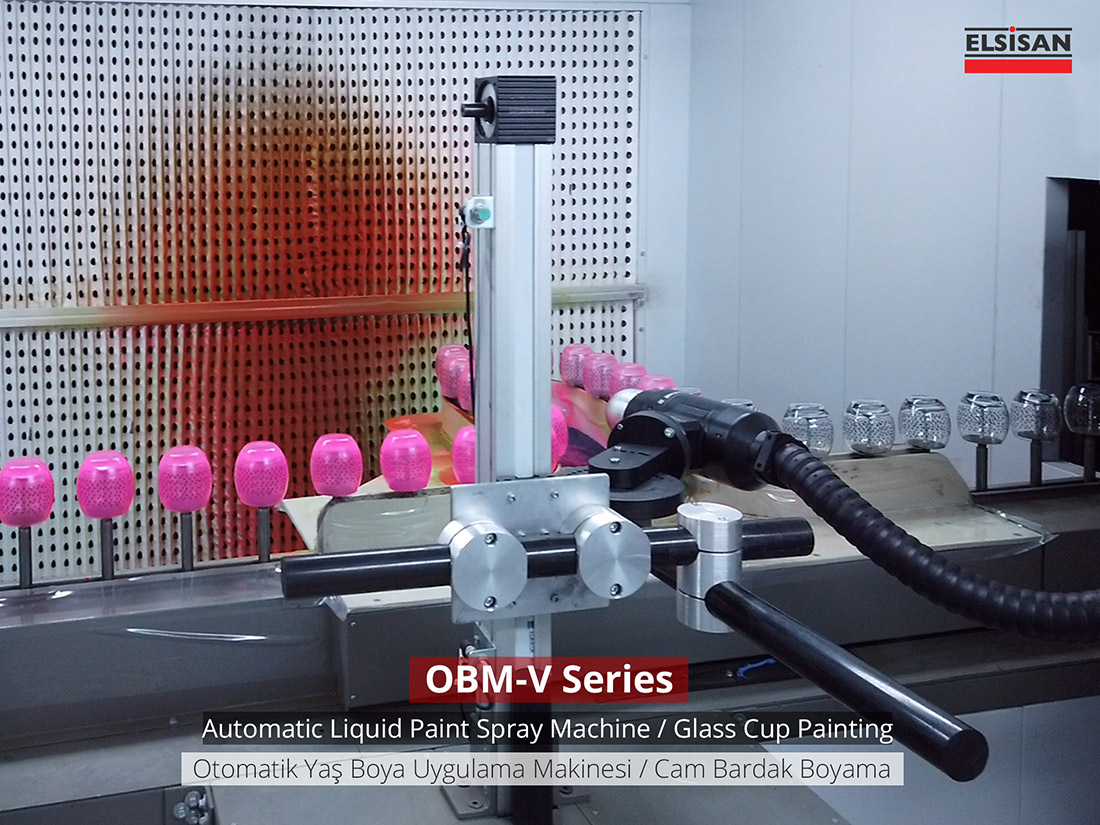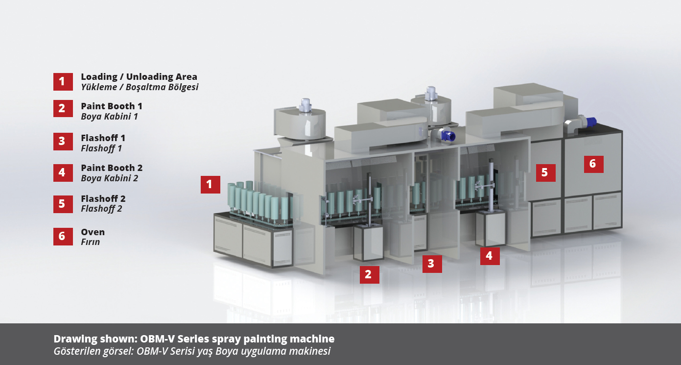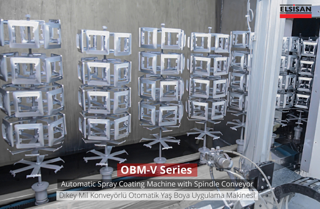 Automatic chain-on-edge / spindle type spray coating machine provides automatic painting to small-sized metal, plastic and glass products for high production numbers. With its compact structure, it can be installed in small areas and lowers investment and operating costs. The materials lined up on the apparatus in the loading zone pass through the surface preparation section in accordance with the process, are cleaned from the surface dust by antistatic air, if necessary, flamage application is made and they reach in front of the robot in the painting booth. Paint is applied to the rotating parts with a 2-axis robot. Then, it is circulated in the drying oven for the specified time and brought to the unloading section. All these operations are done automatically with the PLC system on the control panel. Different methods can be prepared and saved according to each different piece, thus preventing time losses and errors.
