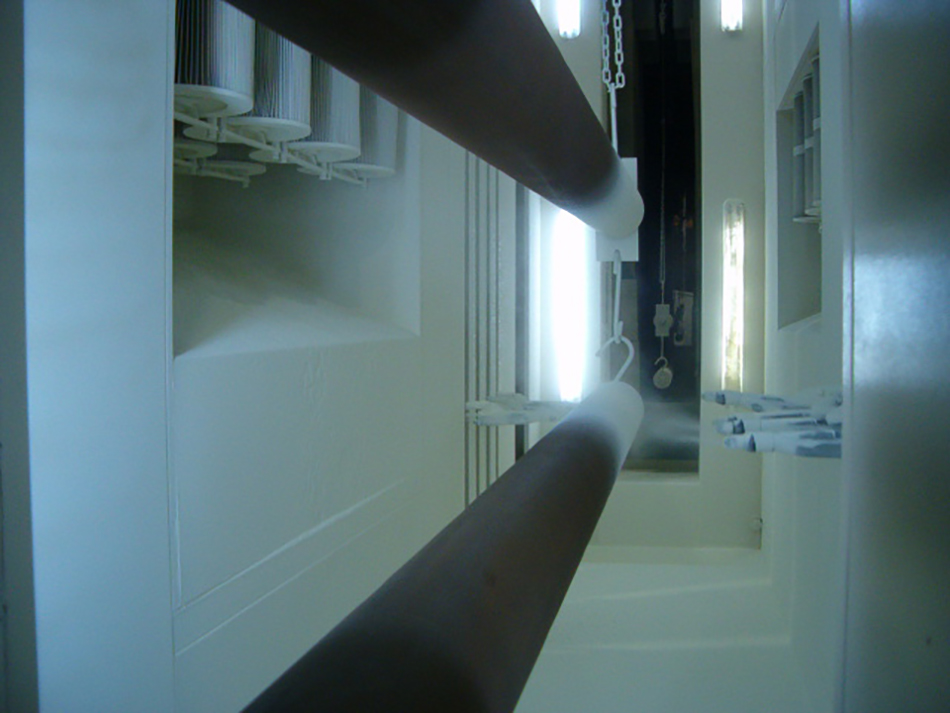 The cartridge filters are cleaned automatically via an electronic pulse system controlled by a built-in circuit board, while manual filter cleaning buttons are also available on the control panel. Air is drawn through the cartridge filter area in the booth, allowing overspray particles to be effectively collected.