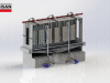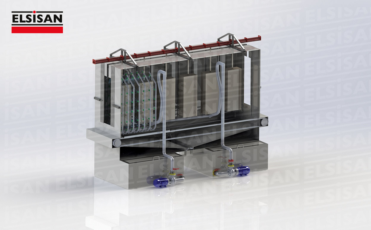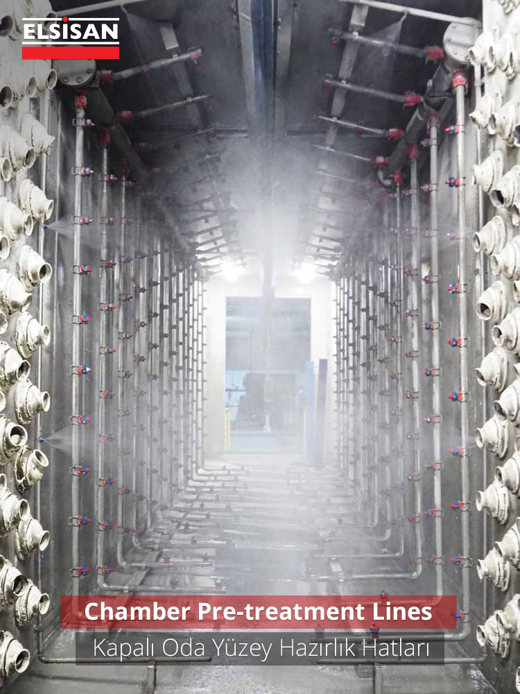 It has made for an alternative to classical spray cleaning lines with a conveyor. Continues system paint facilities, connected to conveyor speed and material dimensions, can be too long and occupy too much place in the factory. As an alternative to them, step controlled paint facilities and lines can be designed. In these lines, conveyor moves as a certain distance and stops for a while, during the stop time, the doors on the entrance and exit sections of the spray cleaning chamber close, the nozzle group moves and cleaning process starts. Thus, several processes can be realized in a chamber. Therefore, there is a big advantage to have less space occupied. According to material dimensions and capacity, special chamber pretreatment lines can be designed.