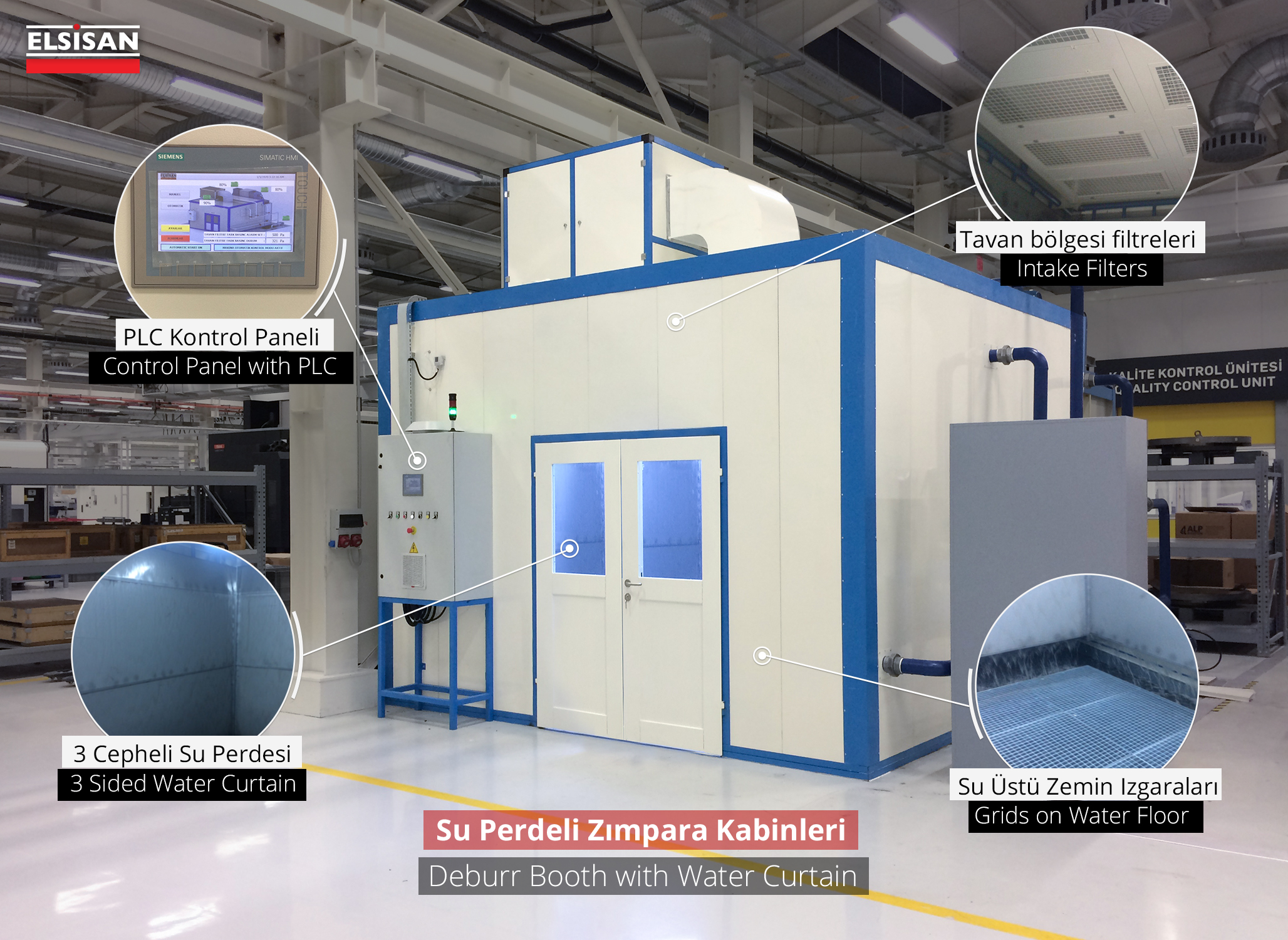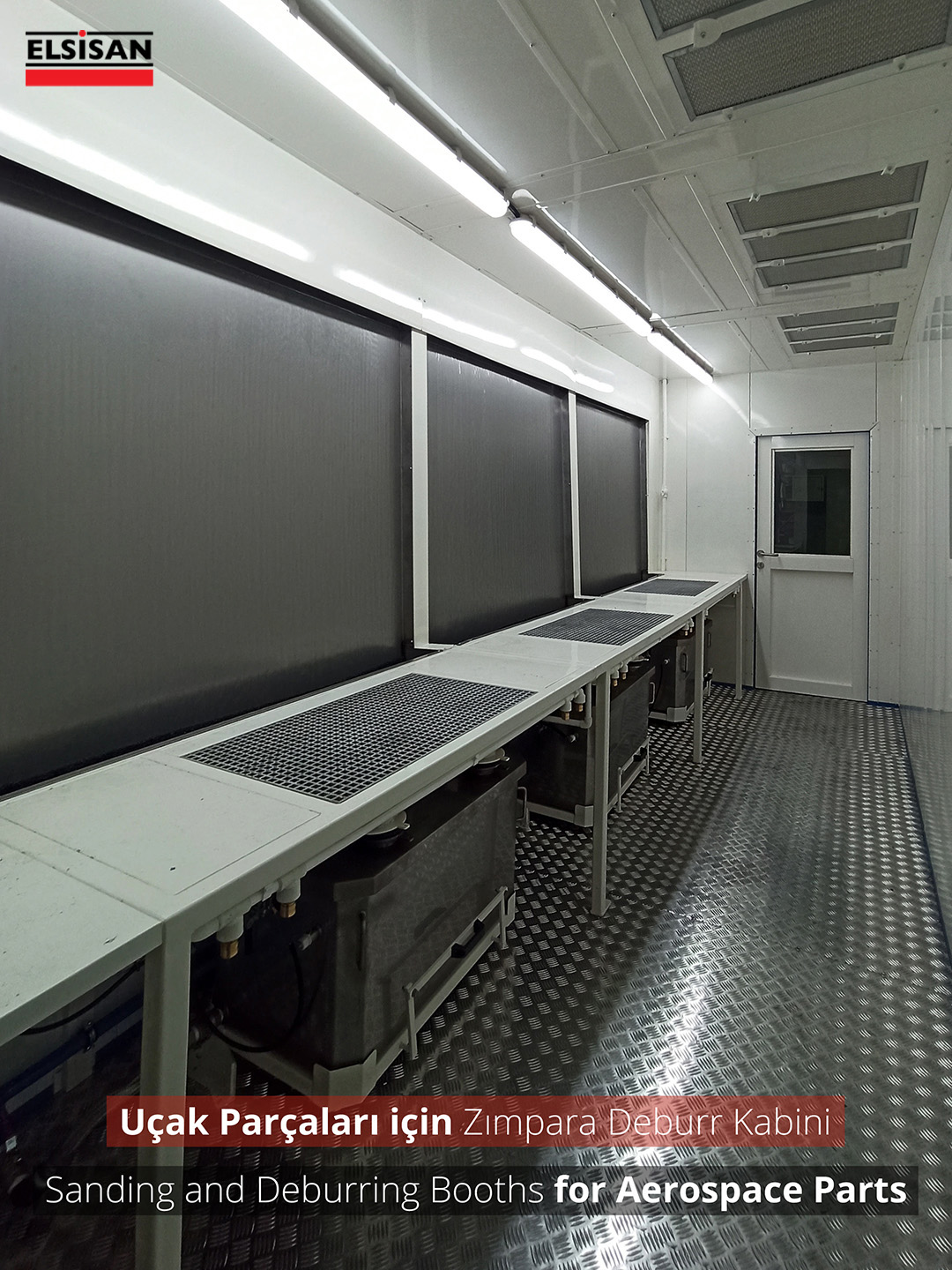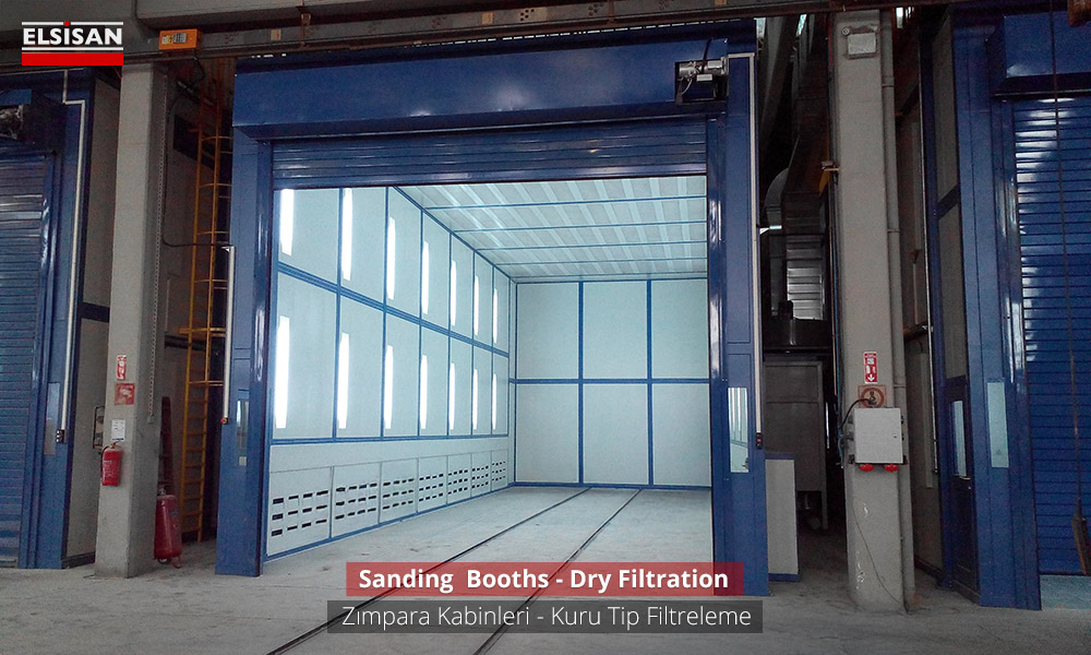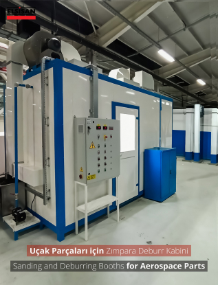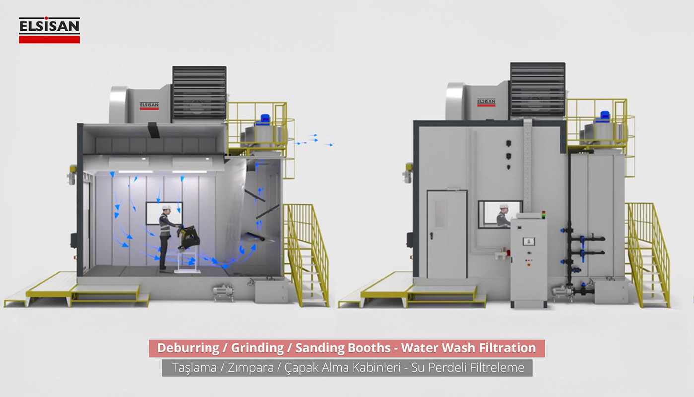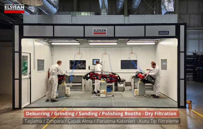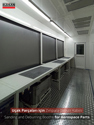 In Deburring/Downdraft Booths, the dust produced during the sanding process is held by the floor sucking system and releasing it to the factory environment is prevented. Suction air hits the crusher at the entrance of dust collecting unit. The crusher protects the filters from particles and it ensures that the dust goes directly to the collection bucket. Small particles are passed through polyester teflon filters in the direction of air suction and kept on the filters. The dust accumulated on the filters is poured into the dust collection tank by means of pulse valves. The filters are cleaned automatically by the electronic card in the panel.