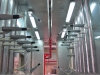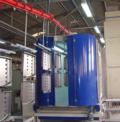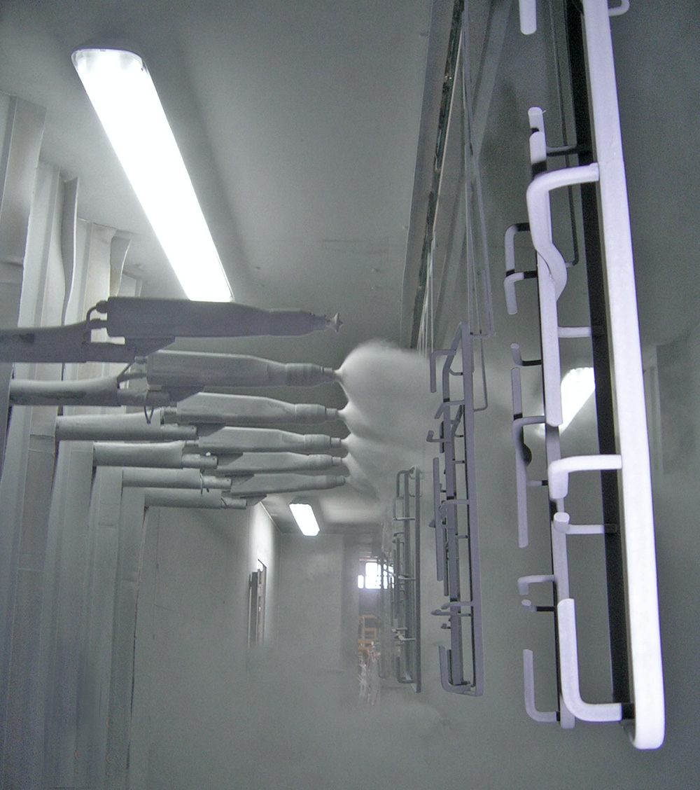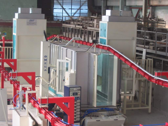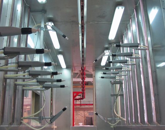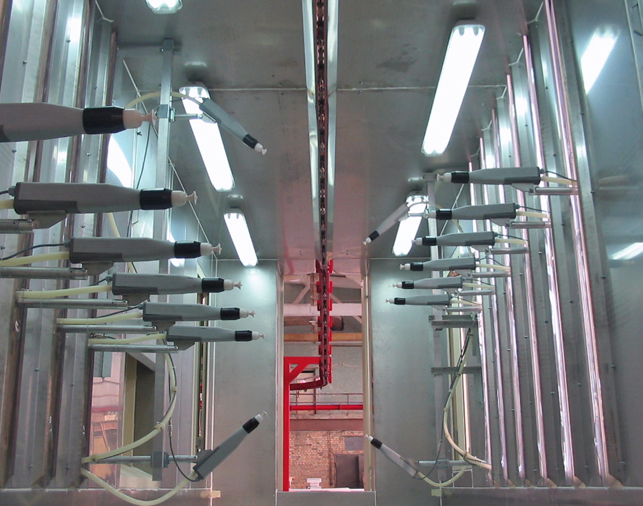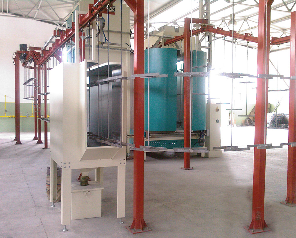 Application in powder enamel plants works the same as the principal of static loading and coating of powder paint. The most important difference is to spray too intense powder, due to the thicker application of powder enamel. For this, booth and guns are specially designed. Since too much enamel powder accumulates in the booth floor %100 of recovery for enamel powder is possible by automatic ground sweeping system.